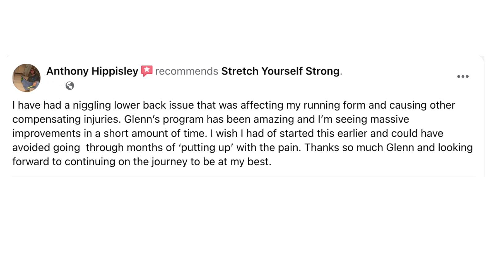 As I become older niggling injuries and muscle tightness has increased. These injuries have almost dissapeared due to Glenn’s guidance and expertise.
